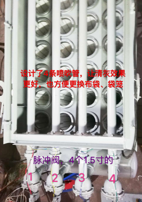 4个脉冲阀4条喷吹管,让清灰效果更好,也方便更换除尘袋、袋笼