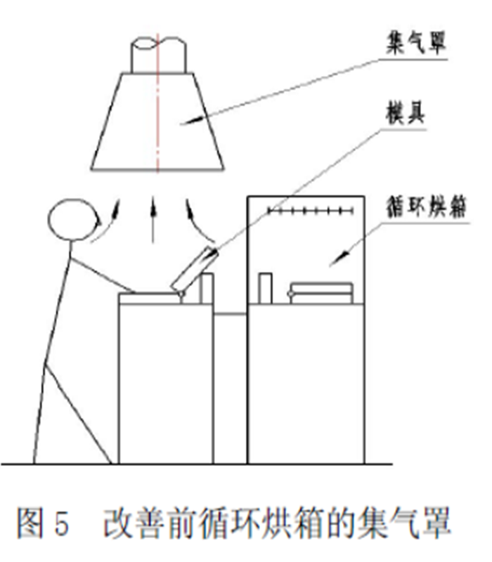 图3为工业生产中广泛使用的装配加工生产线的集气罩结构,采用大尺寸罩口,罩口吸气面积A较大,需配以较大排风量,因而不能有效集中控制风量吸捕污染源散发出来的污染气体。若将其设计改为如图4所示,即在罩内加装弧形挡板,使整体大罩口被分隔成小罩口,对准工件(污染源)上方,这样大大减小了罩口面积A,相应排风量Q减小,使用较小的吸风量即有效的控制了污染气体的逸出,产生了较好效益。图5为循环烘箱工件脱模工序的集气罩结构,经加热后的化工制品及模具离型剂,产生了大量的有害气体,为了有效吸气和不妨碍工人操作,将集气罩置于工作台的正上方,罩口距离较远,这样不仅增大了罩口的吸气范围,而且容易受到室内其他气流干扰,同时在污染气体抽吸入罩口过程,经过操作人员的口、鼻,直接危害工人的健康。