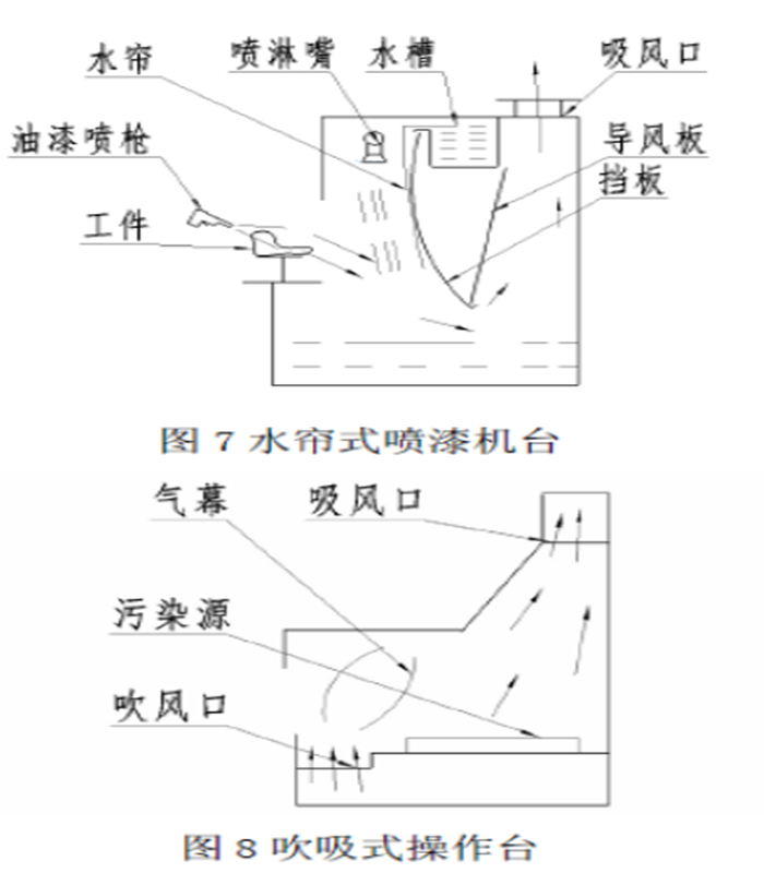 工业生产过程中由于工艺操作的特点及现场实际情况集气罩必须满足其特殊要求,如喷漆工序产生大量的过剩雾化颗粒与周围空气形成的混合污染气体,通过罩口直接吸入就增加了净化设备的负担,且滞留、粘附于管壁的油漆不易清理。如图7根据该工艺特点在集气口前加装了喷漆水嘴及挡板,使之形成一道水帘,喷漆枪喷出雾化的油漆经过挡板阻隔及水帘过滤后,利用导风板将处理后的混合气流吸入罩内,这样有效的控制了污染向周边环境扩散,减轻了净化设备的负担,也避免了油漆粘附于管壁,简化了日后的维修清理,水帘式喷漆机台的吸气结构较为经济,有效的控制喷漆工序造成的周边环境污染.在某些情况下外部罩与污染源距离较远,结构上不允许将罩口靠近污染源,单纯依靠罩口的抽吸气流作用往往控制不了污染源的扩散。采用图8吹吸式操作台联合罩结构产生了较好的效果。联合罩利用吹气气流(喷射气流)比吸气气流速度衰减大数十倍的特性,即在一侧吸气的同时在另一侧吹出气流,形成一道气幕,从而组成吹吸联合集气罩,有效的阻止了有害气体外逸扩散,有效的提高了控制效果。吹吸式集气罩由于依靠吹吸气流联合对有害气体进行控制输送,具有风量小,污染控制效果好,抗干扰能力强,不影响工艺操作等的优点,近年来在国内外得到了日益广泛的应用。